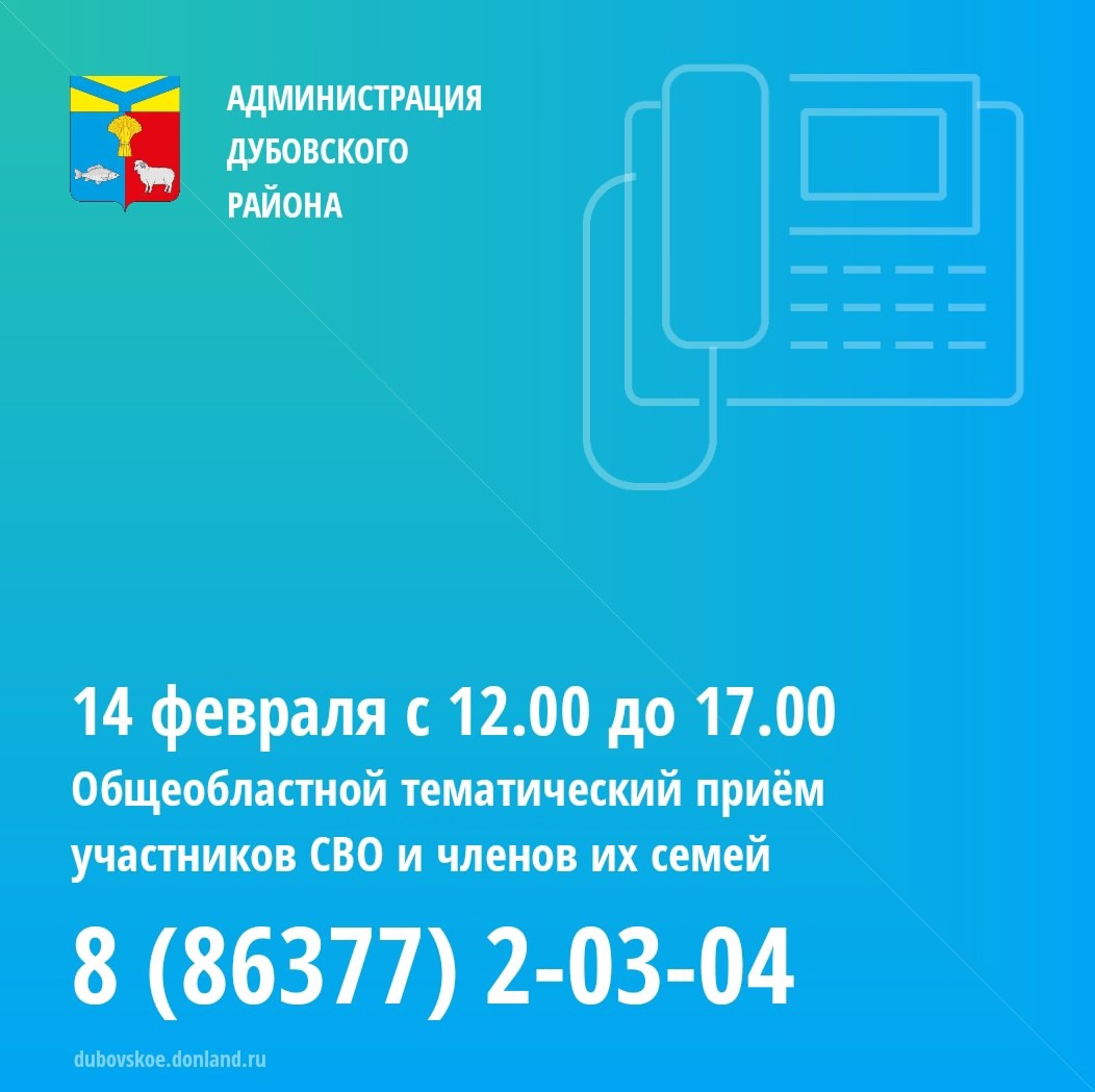 Прием будет проводиться 14 февраля 2025 года с 12-00 до 17-00 часов, в здании Администрации Дубовского района по адресу: с. Дубовское, пл. Павших Борцов, 1, каб. 37. На приеме при себе необходимо иметь паспорт и документ, подтверждающий статус участника СВО, либо члена семьи участника СВО.